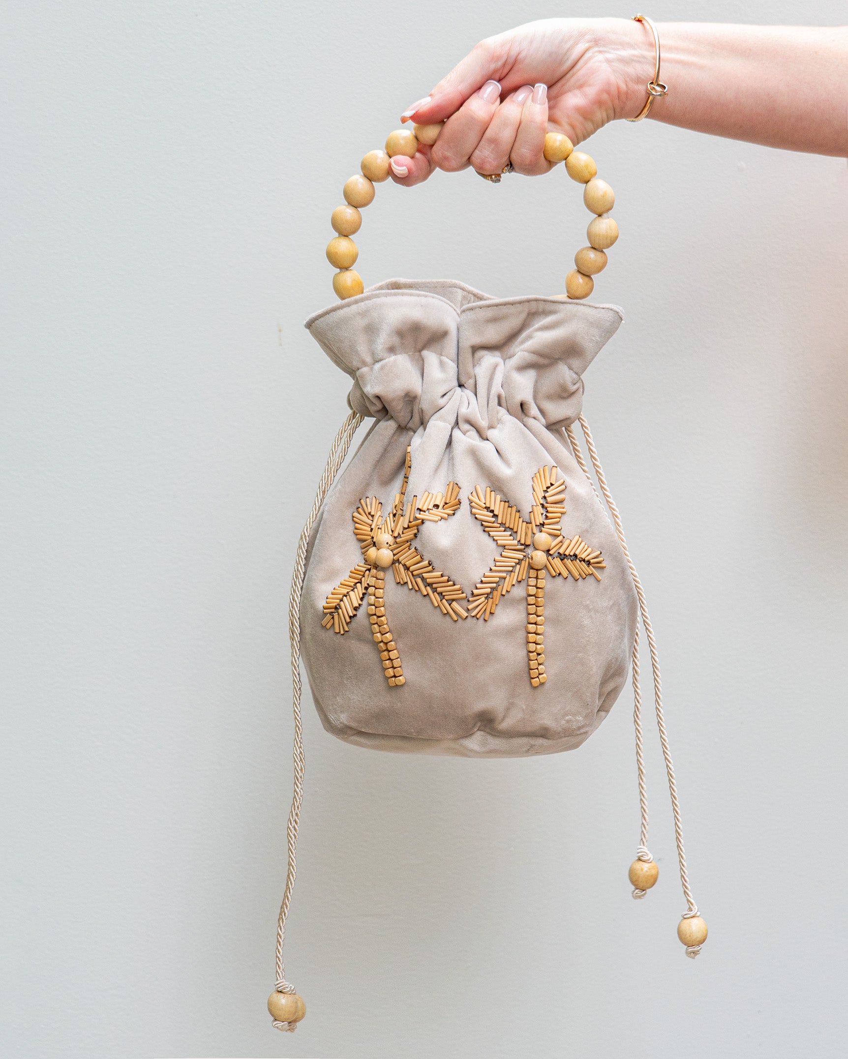 The Nannacay Carol Bag is a beautifully handcrafted small bag designed with a structured bottom for added stability and features an adjustable cinch tie that allows for customizable closure. Adorned with an embroidered palm tree detailing and a unique wooden beaded handle.