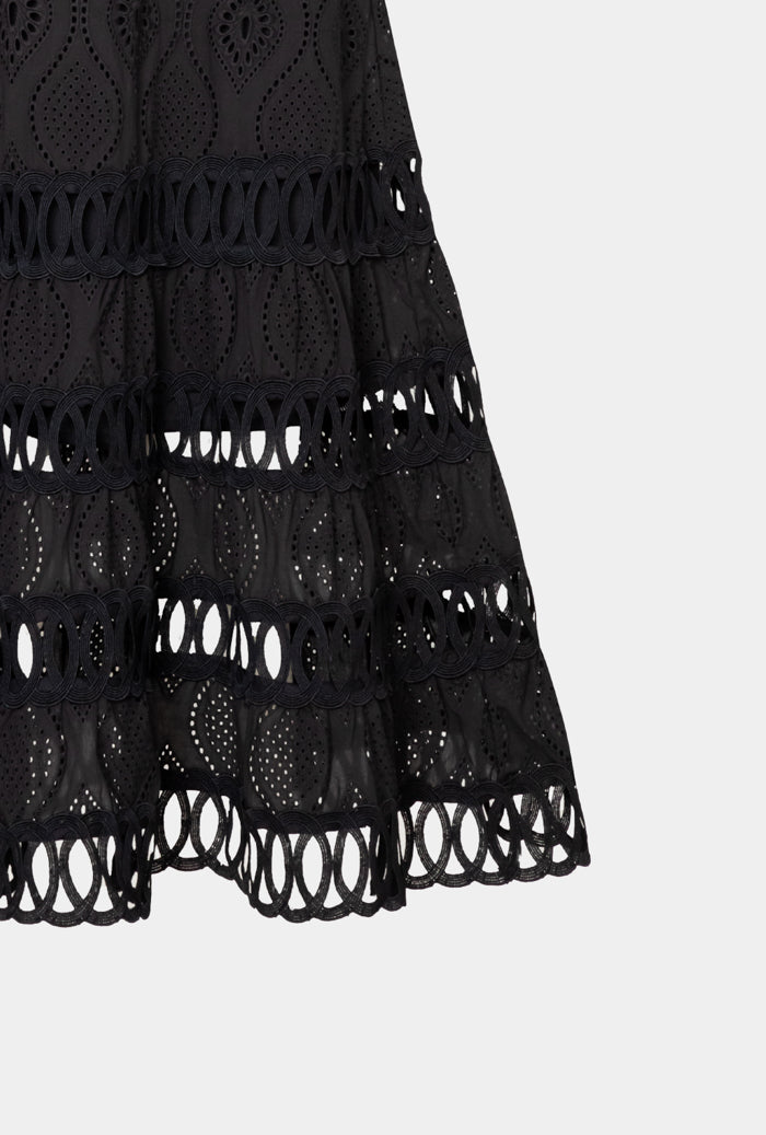 Maxi dress with a square neckline and shoulder straps. It features an A-line tiered skirt with trim inserts accentuated by a scalloped trim at the hem. The whole piece is adorned with different trims along the neckline, waistline and straps. The dress fastens at the back with a concealed back-centered zipper. Made of embroidered cotton eyelet fabric.