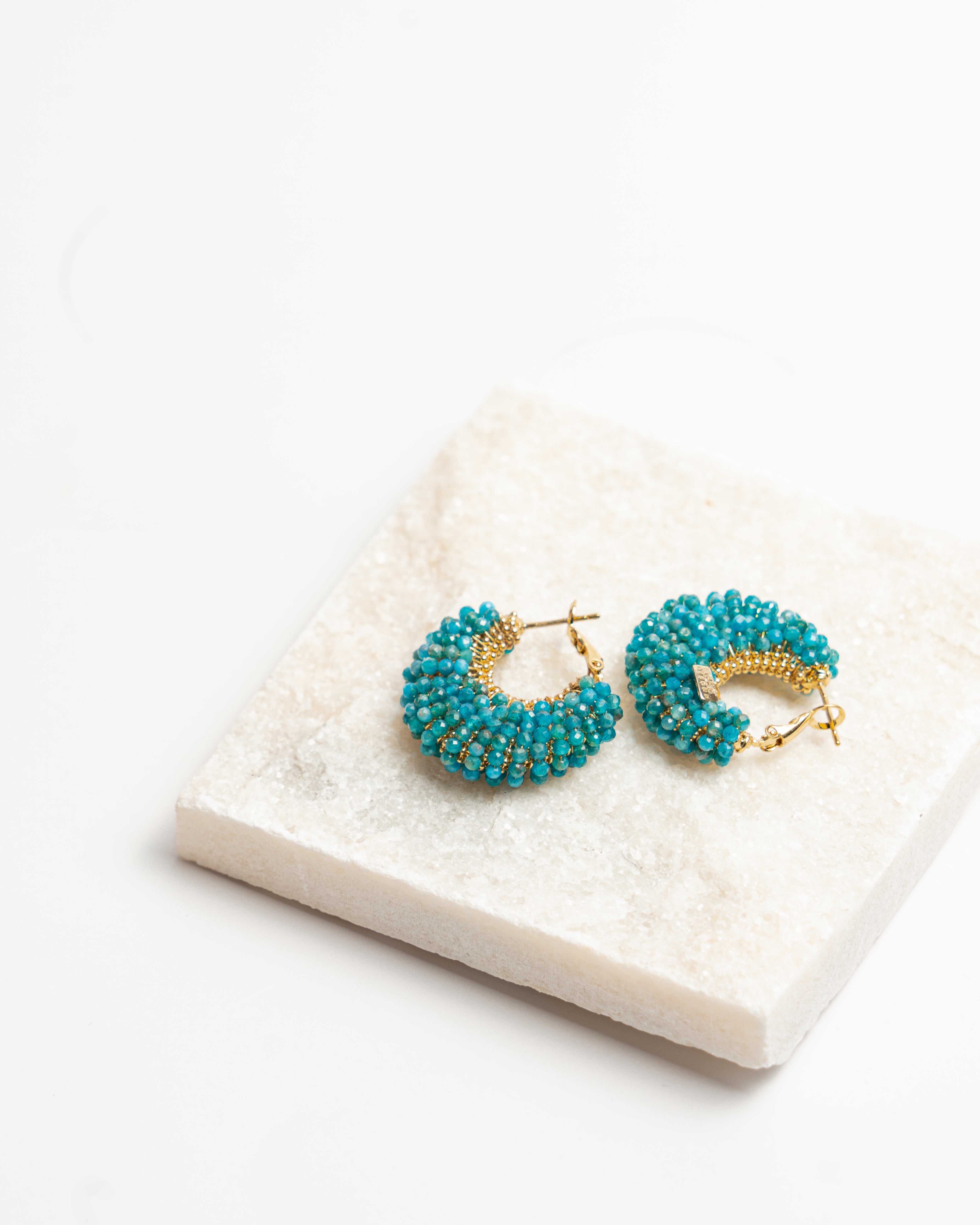 Gold plated hoop earrings composed of a base made of threads and golden beads and adorned with colored pearls.