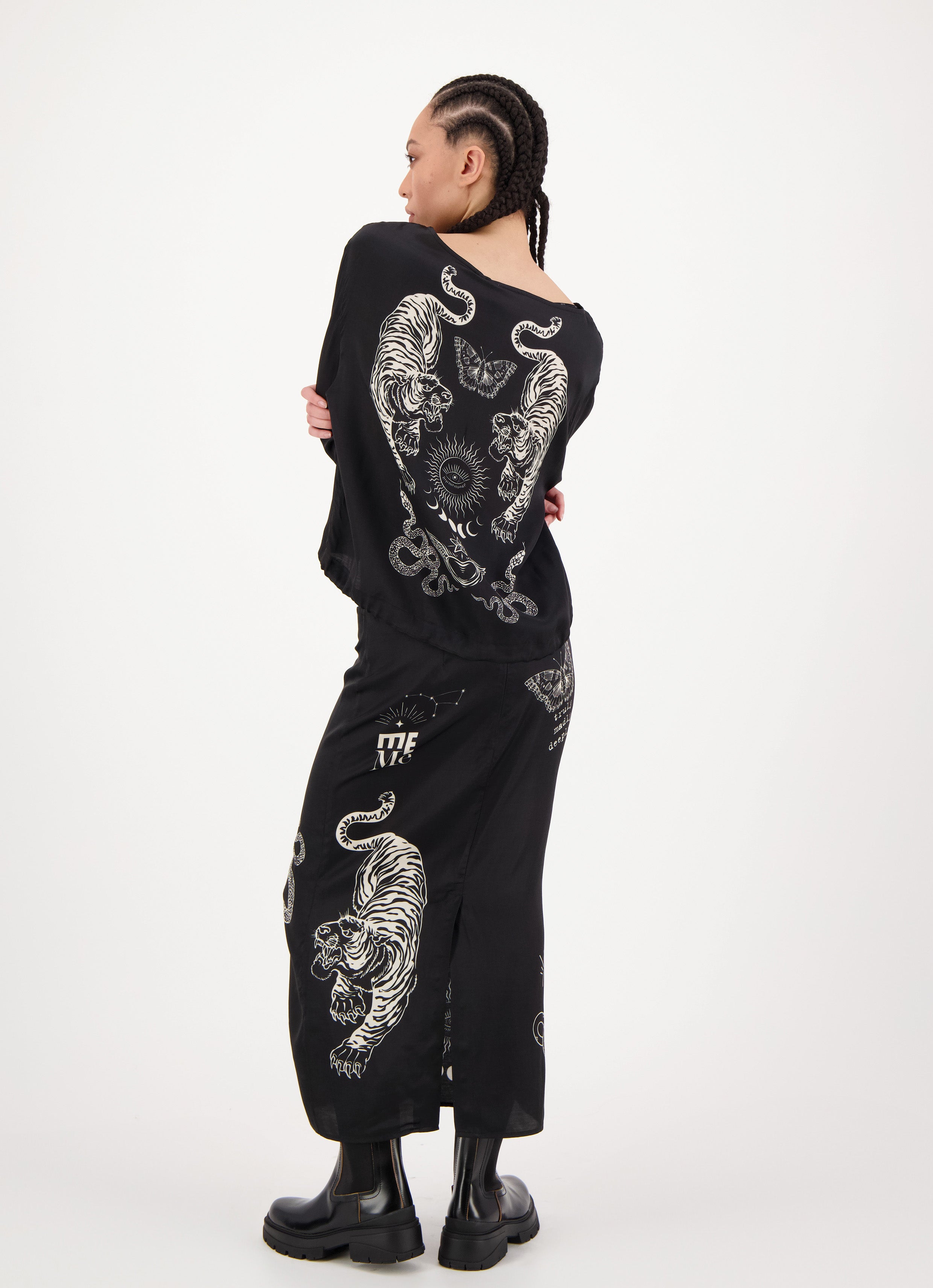 The Valery Black Magick Skirt is a slip-on maxi skirt featuring an elasticated waistband for ultimate comfort and a sleek, slip-style silhouette. Adorned with a striking tiger and moon print, it also includes graphic messaging that adds a unique touch to its design.