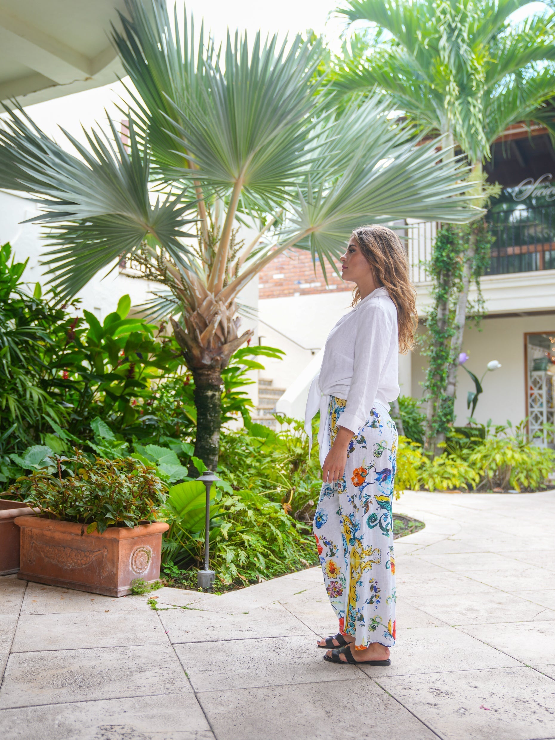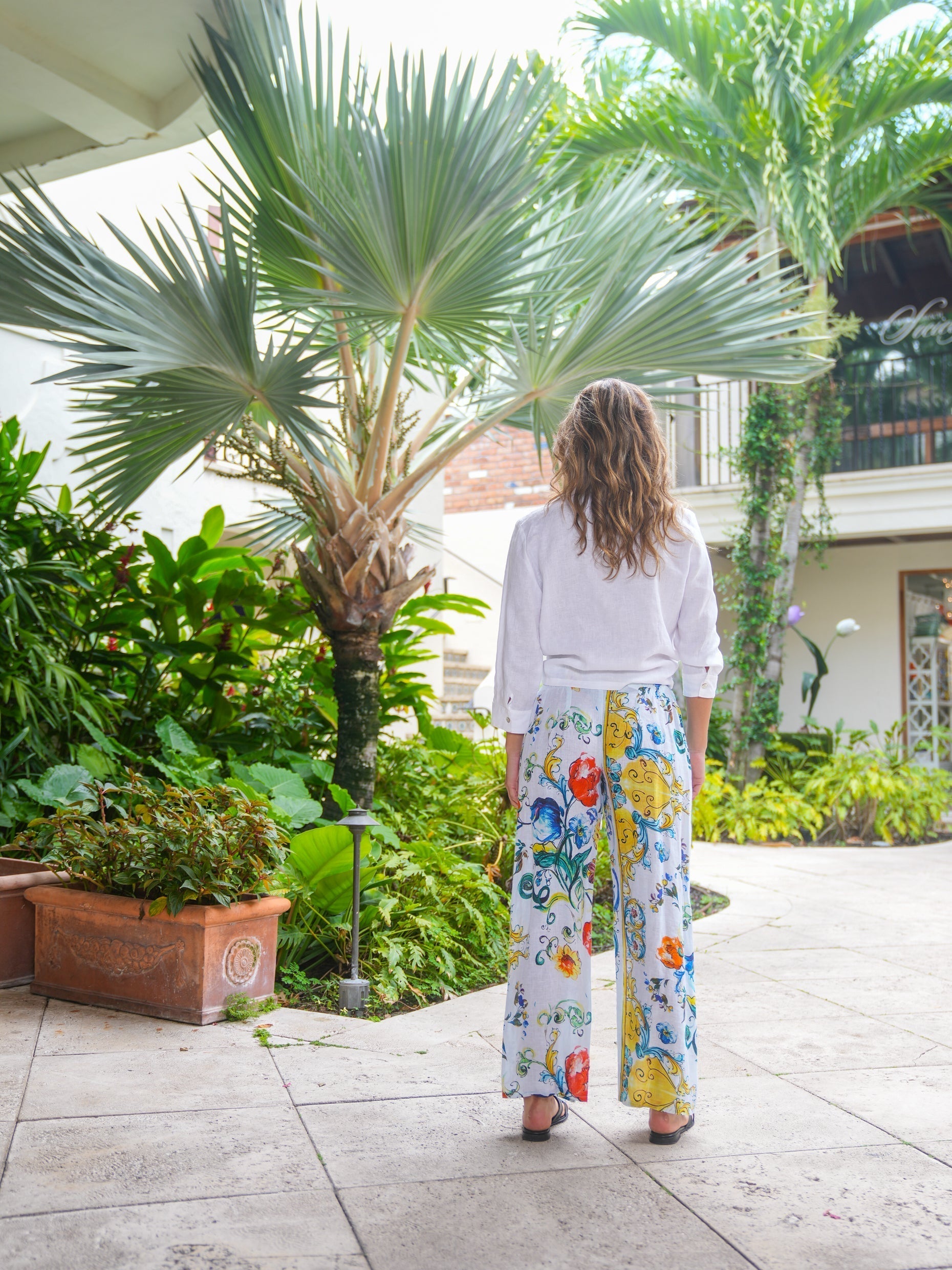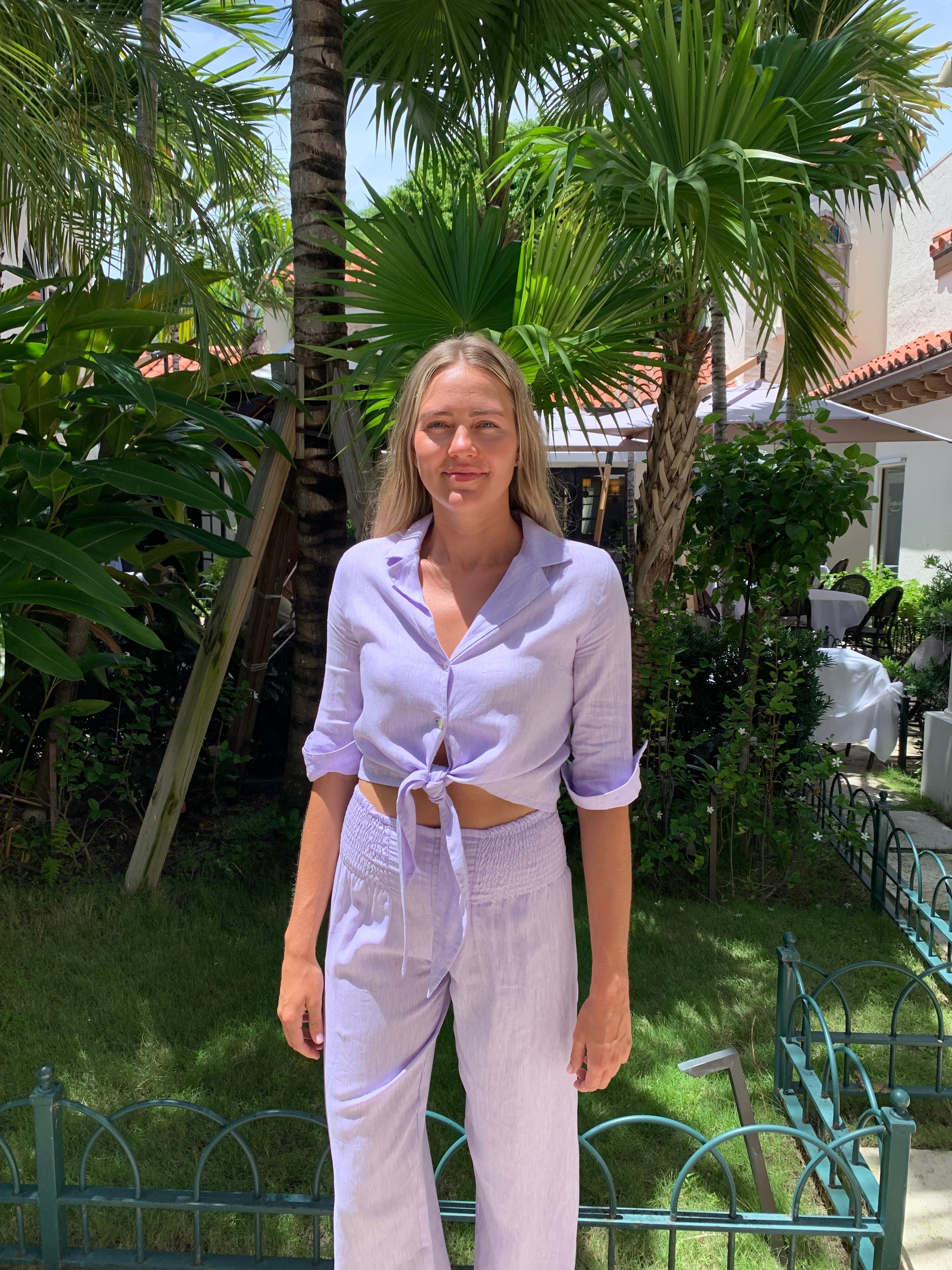 Our blazer nodo centrale is a long sleeve linen crop top. It has two buttons and is tied in the front. It's designed to style any of our pants and gonna corta or gonna Marina skirts.