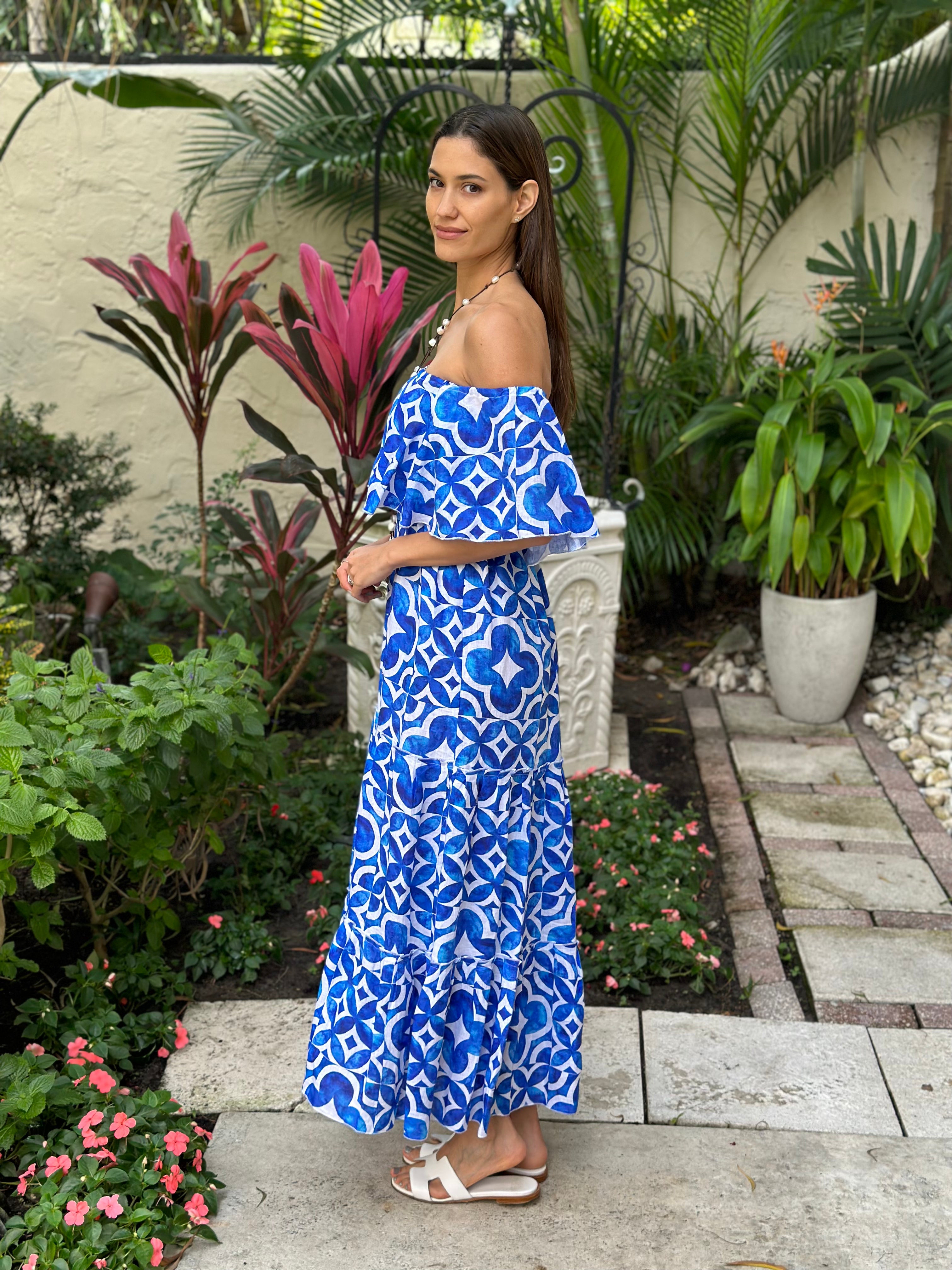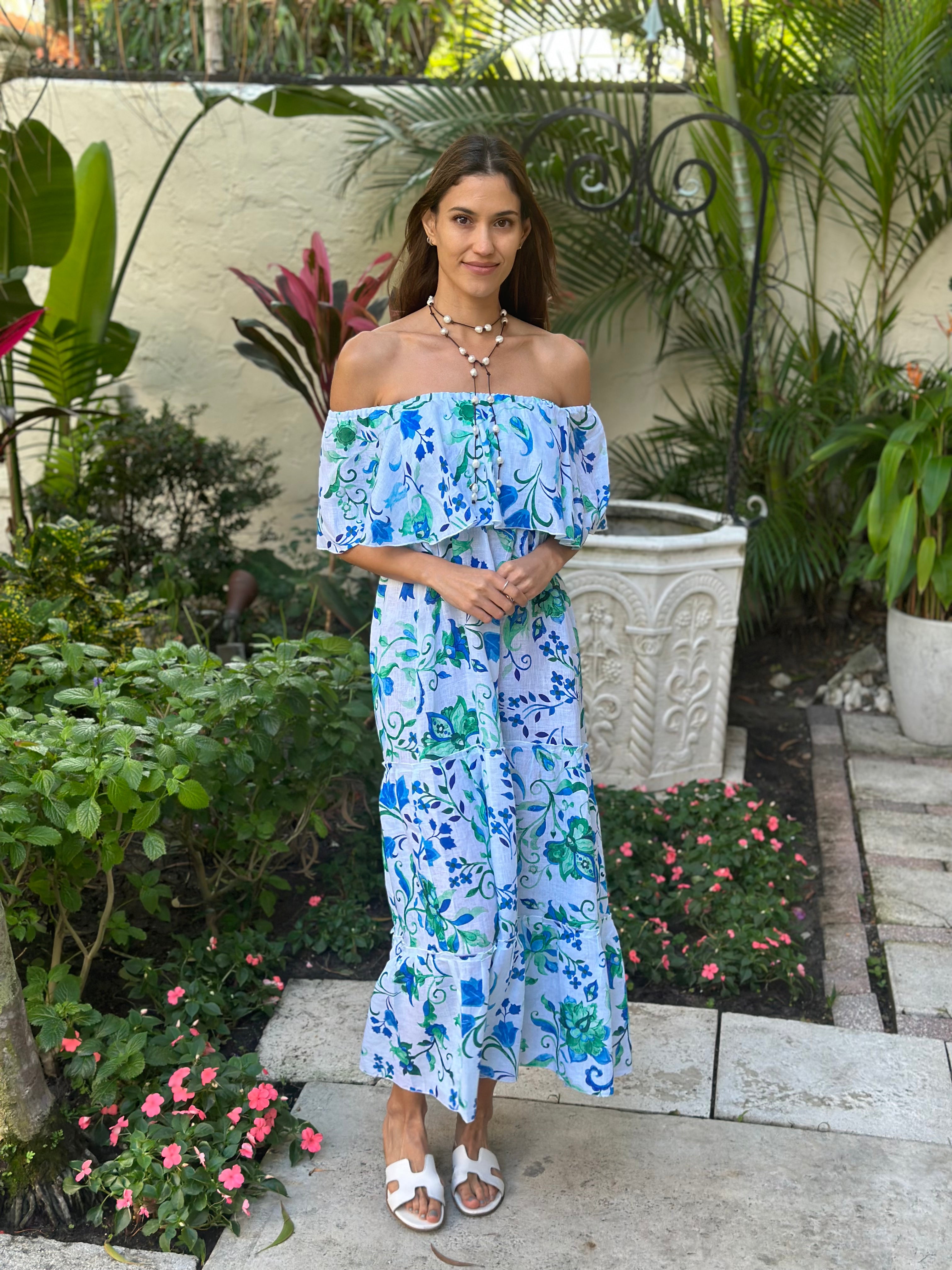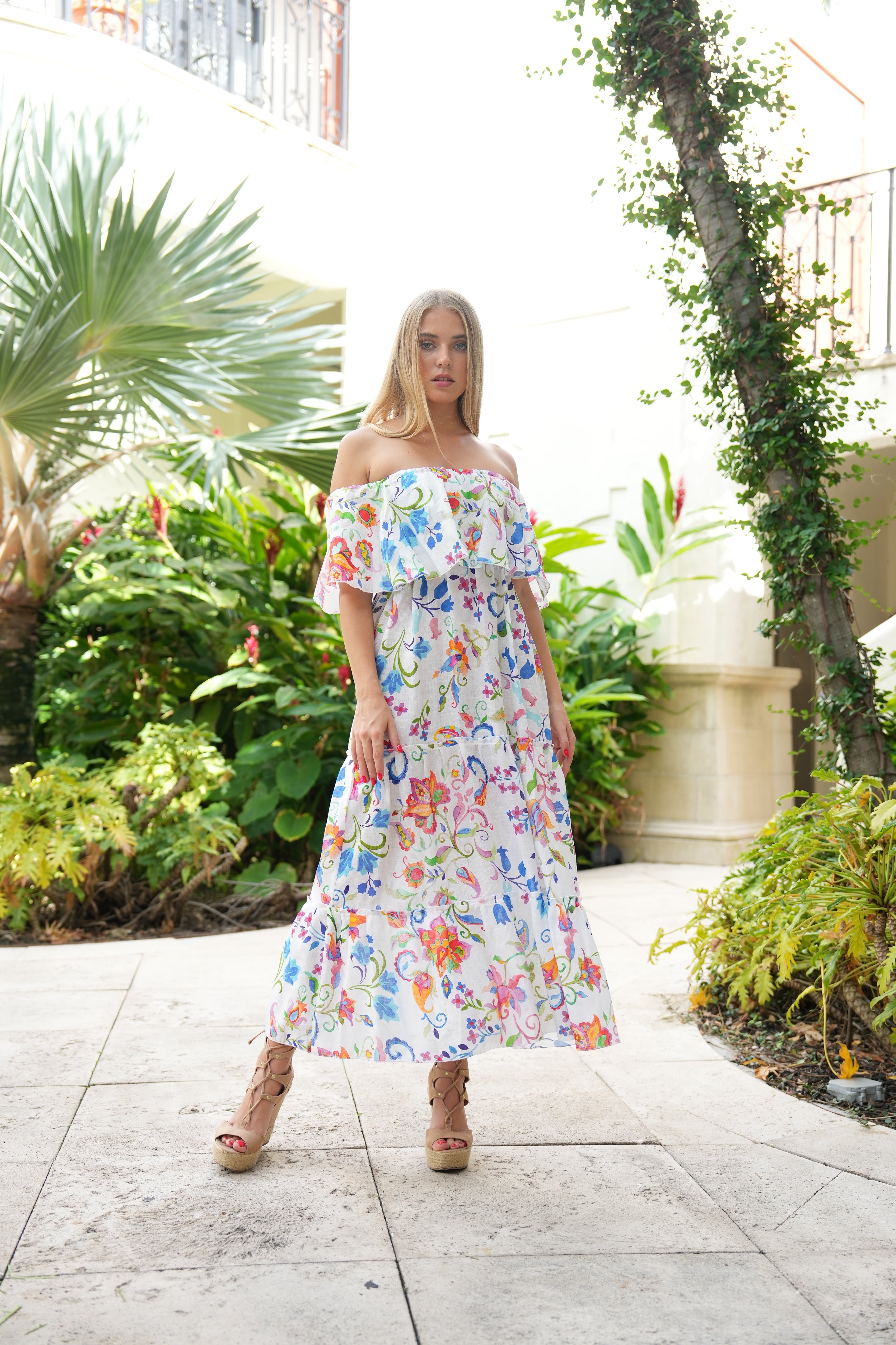 Our Balze Orlini dress is versatile and glamorous. It has richly detailed prints, colors, and romantic silhouettes for a timeless, fresh and comfortable look. Details like the puff sleeves, oversized tired skirt, and off-the-shoulder neckline make this dress perfect for outdoor dinners. Glam it up with our Schutz Thea Block Gold sandals and our gold Gas Bijoux.