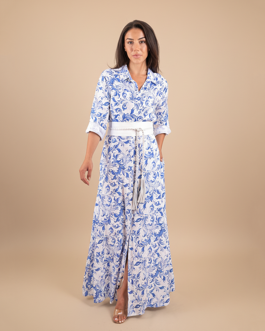Our shirt dress has everything you ever wanted in a full- length, button-up dress. A long, lean, and lovely silhouette that will elongate your torso. Enjoy the versatility of this dress by wearing it as a dress or open as a duster. Wear it casually by rolling up the sleeves or dress it up with one of our leather rope belts for a perfect resort chic look.