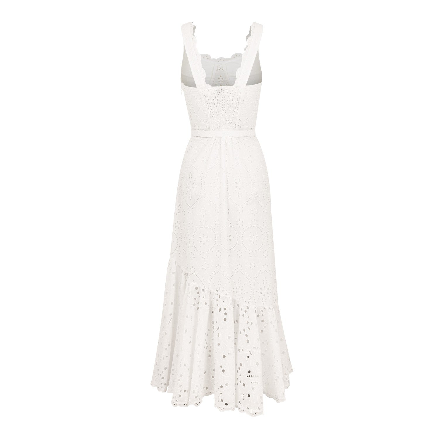 The Tatyana dress is a real eye-catcher with a perfect balconette neckline trimmed with cotton guipure and an asymmetric ruffle skirt. This embroidered cotton dress has a corset-like structure that enhances the beauty of the feminine silhouette. It is cinched at the waist with a belt made of the same quality of finishes.