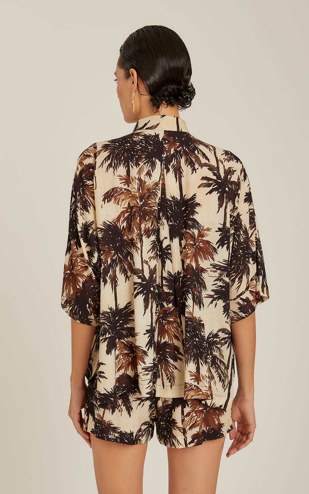 CORUMBAÚ: A watercolor landscape inspired by the beaches of Bahia, the Corumbaú print has a background of natural linen and coconut trees in shades of black and coffee.