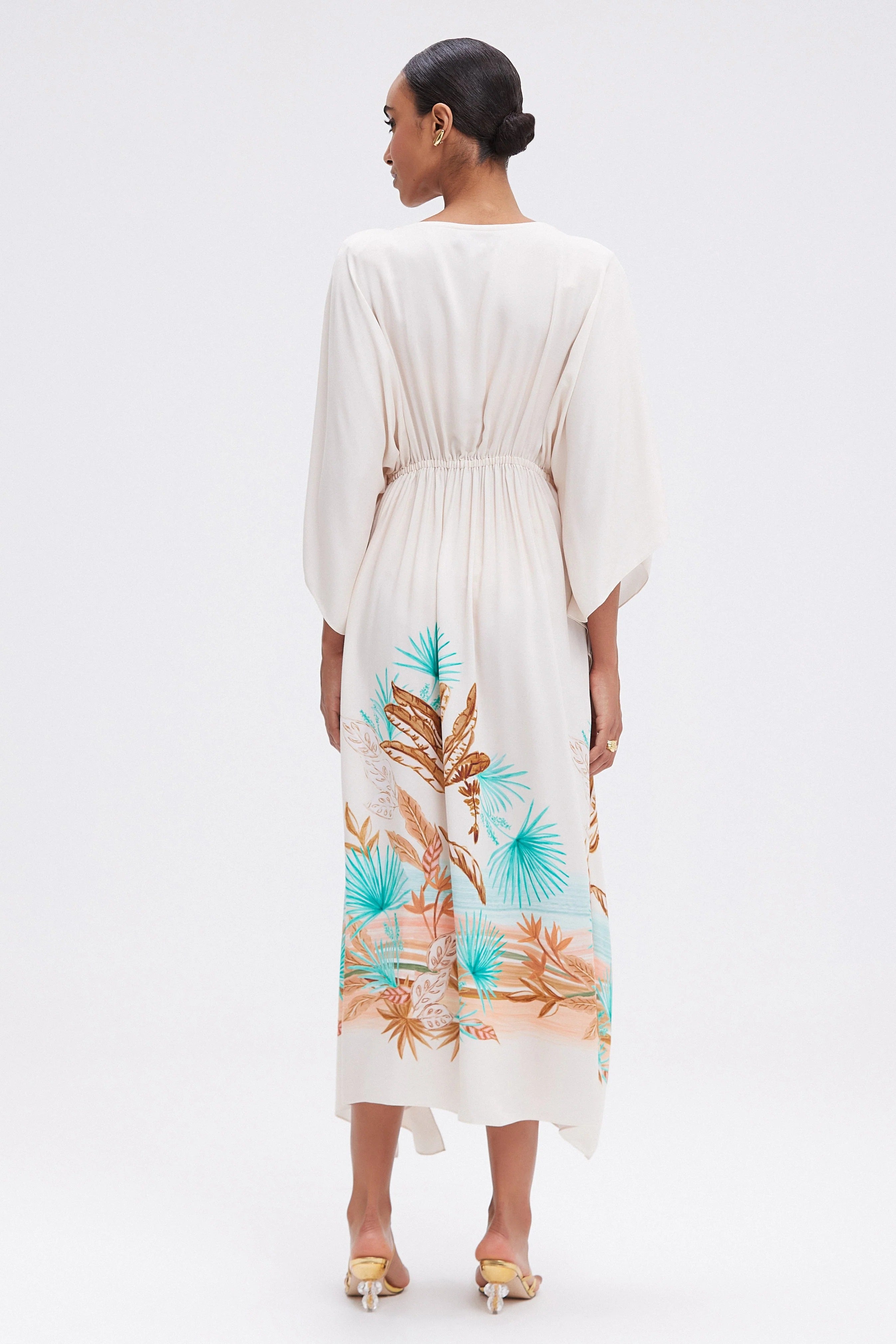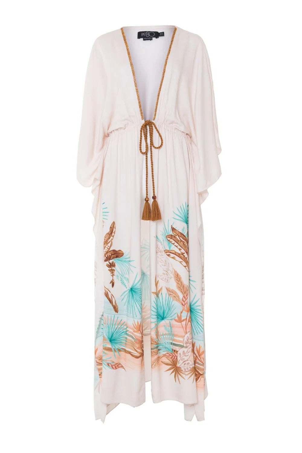 Light and flowy, the Bananeira Tropical Long Coverup is the perfect layer for sunny days. Featuring wide sleeves, a plunging neckline, and a drawstring waist with a tortoiseshell bead detail. Ideal for elevating your beach or poolside look with effortless sophistication. Model wears size 4