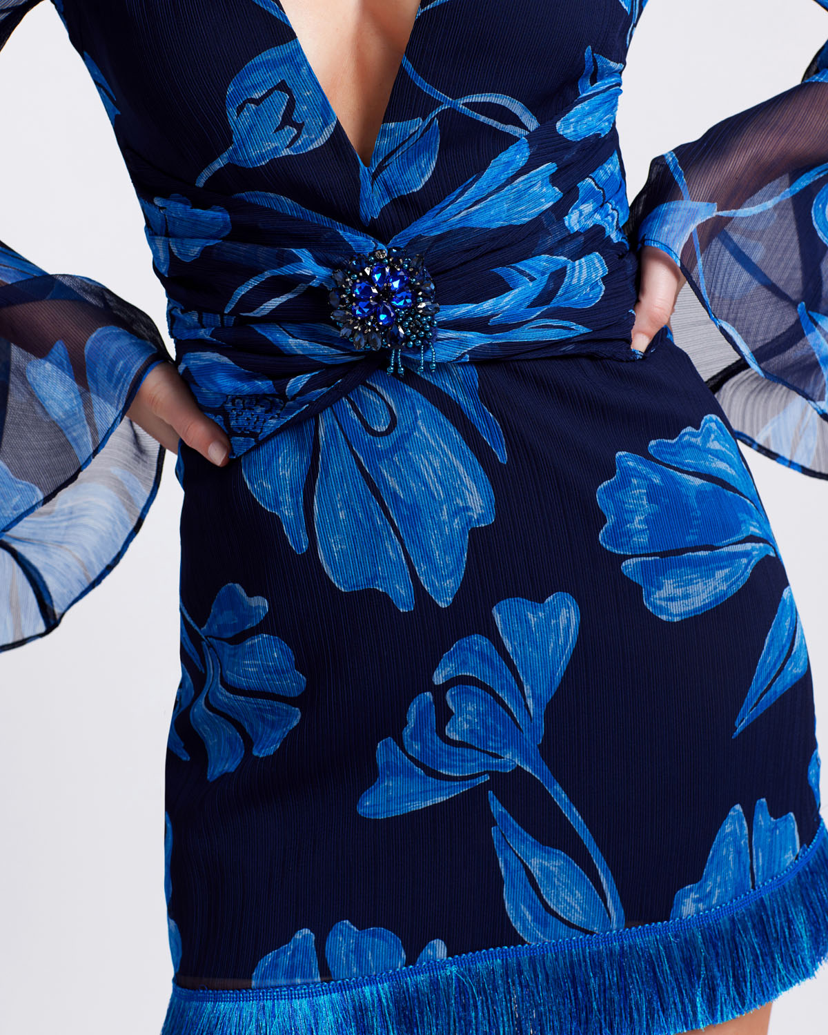 The fringe trim mini dress features a deep V-neckline and bell sleeves. Removable beaded hardware.Concealed back zipper closure. Fully Lined. Runs true to size. Models wears a size 4.