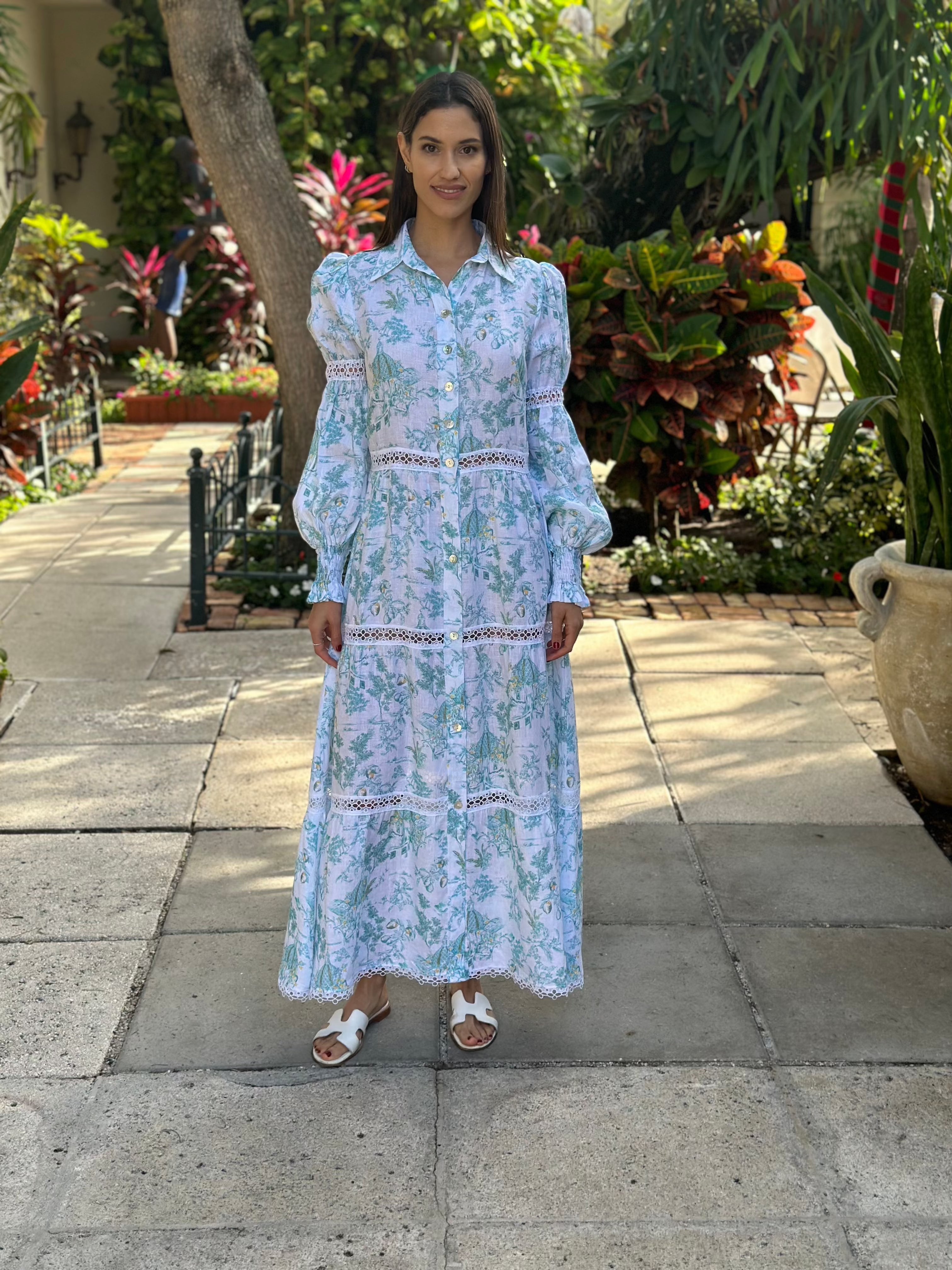 Charming full length and button up dress, with embroidered details at front. Long sleeves.
