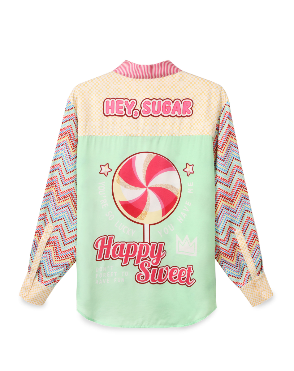 Classic long sleeve collared shirt in a candy theme print. Shirt is buttoned down with a breast pocket. Body of the front of the shirt is the candy print. Sleeves are in a contrasting geometric print. Back of the shirt features a large lollipop and has lots of cute slogans, “HEY, SUGAR”, “YOU’RE SO LUCKY YOU HAVE ME”, “HAPPY SWEET” and “DON’T FORGET TO HAVE FUN”. Pair this shirt with our casual pants for a joyful fun look.