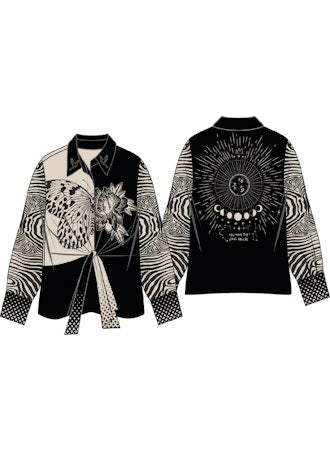 Update your tops with the Reyna shirt. Crafted from viscose, this shirt has a relaxed fit and a lightweight feel, featuring a bird-printed collar, a V neckline, and two front buttons. It comes in various prints, including animal print sleeves, a butterfly and floral design on the front, and a back slogan that reads 'You make the stars collide'. The elegant self-tie detail at the front adds an effortless, draped look to the Reyna shirt, making it a perfect addition to any outfit. Pair it with denim or other prints from Me369 for a stylish look.
