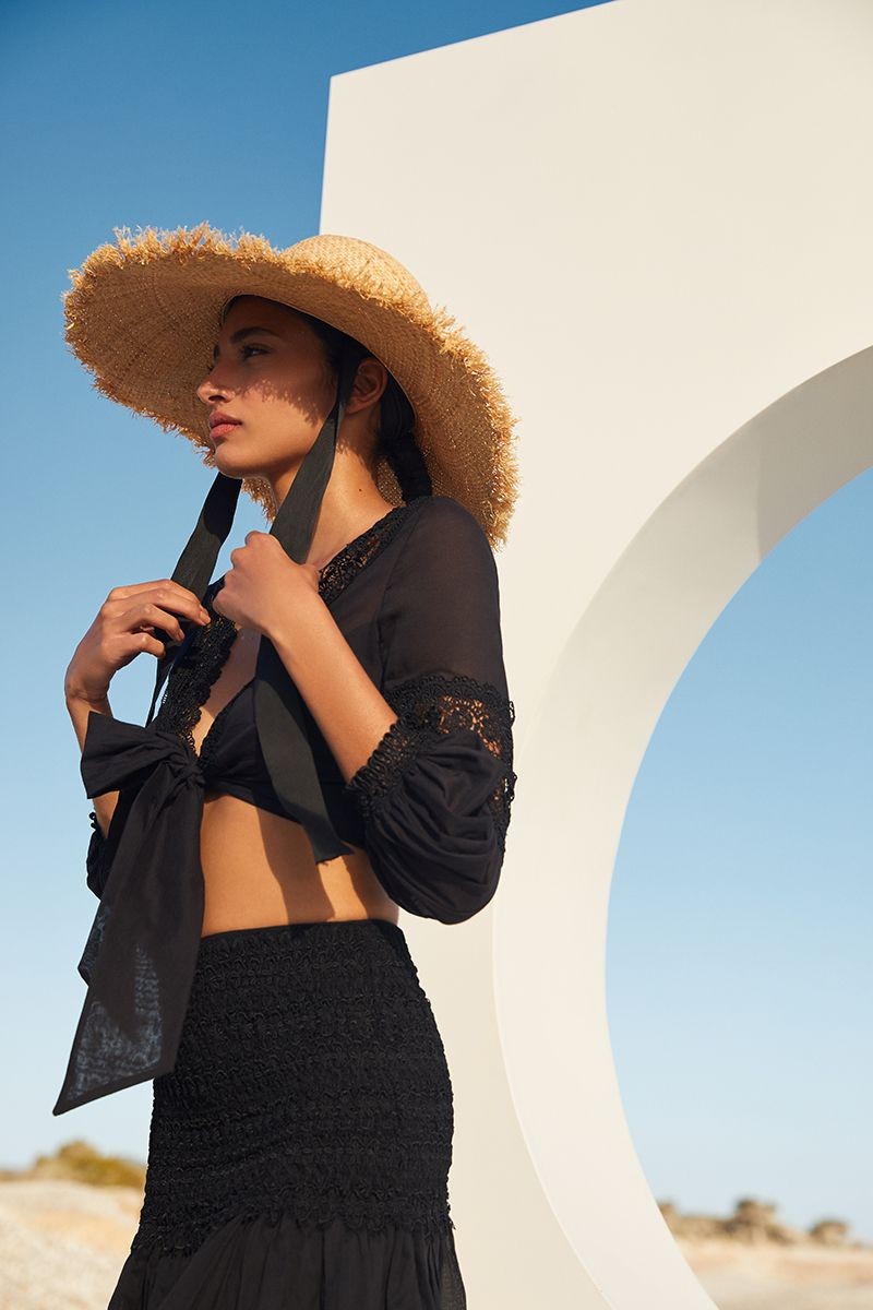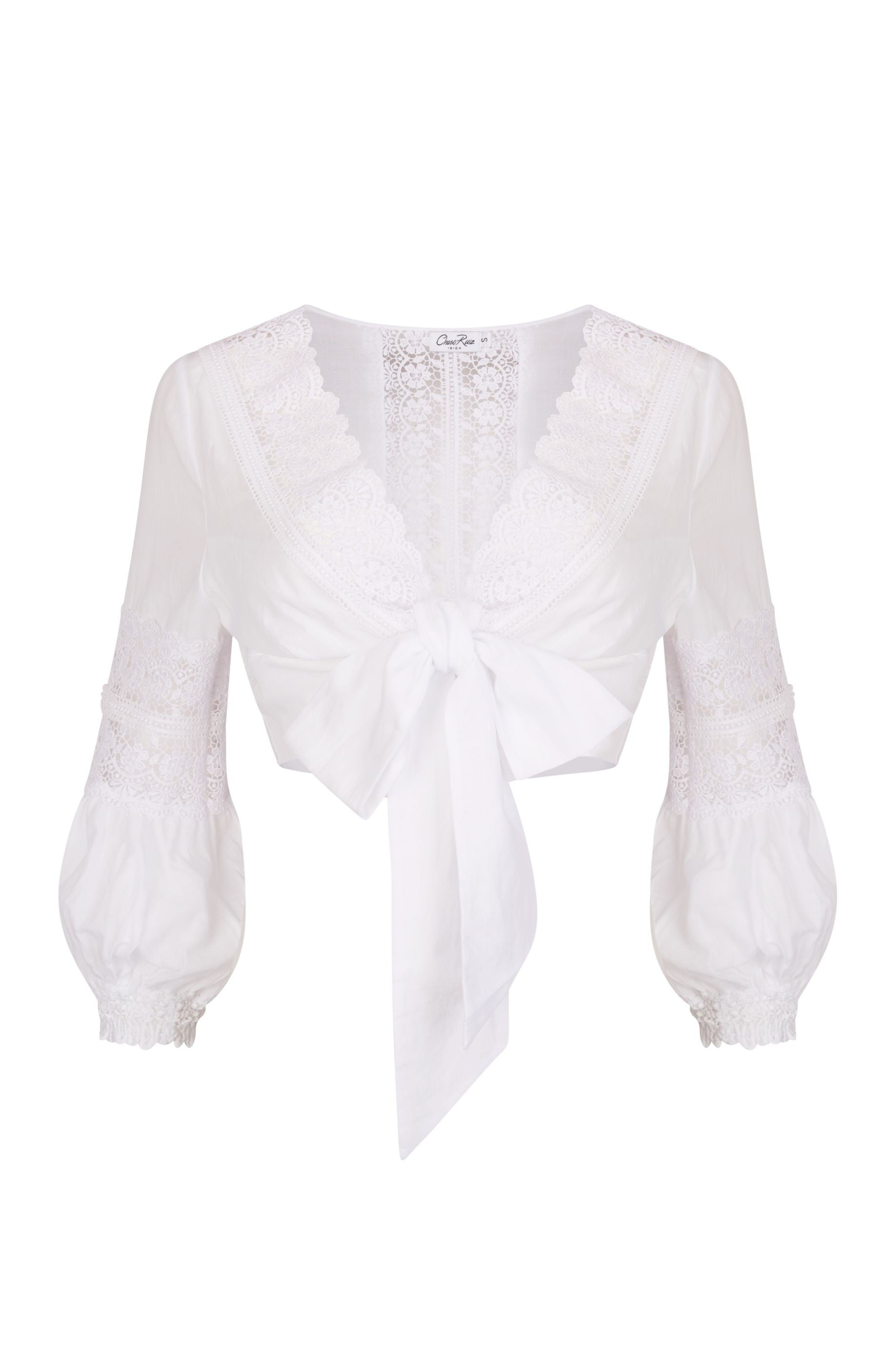 Made from lightweight cotton voile and adorned with elaborate guipure, our Vania blouse knots at the front to create a plunging V neckline. The intricate guipure trims highlight the subtle volume of the sleeve. Pair it with our Silke Maxi Skirt for a romantic look.