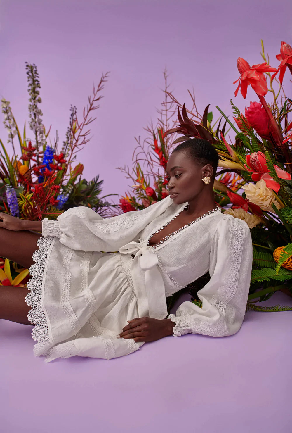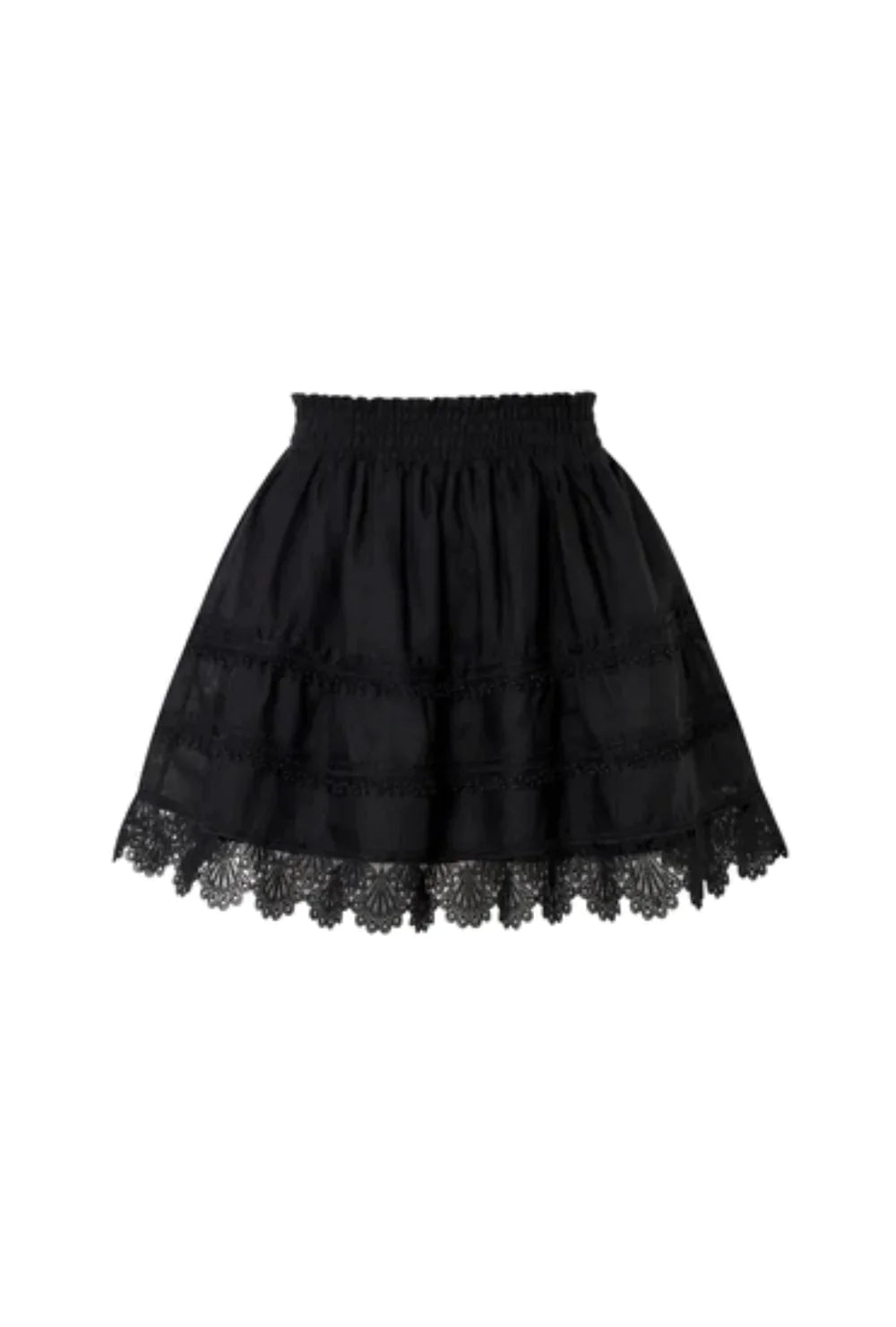 A linen mini skirt may be your best friend at your next tropical destination. Chloe’s skirt features a smocked elastic waistband and tiered ruffles trimmed with shell motif lace. Pair yours with Chloe’s matching top for a pretty set this spring summer