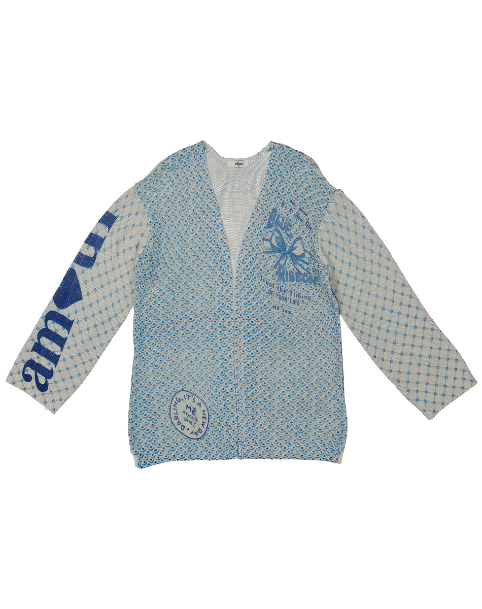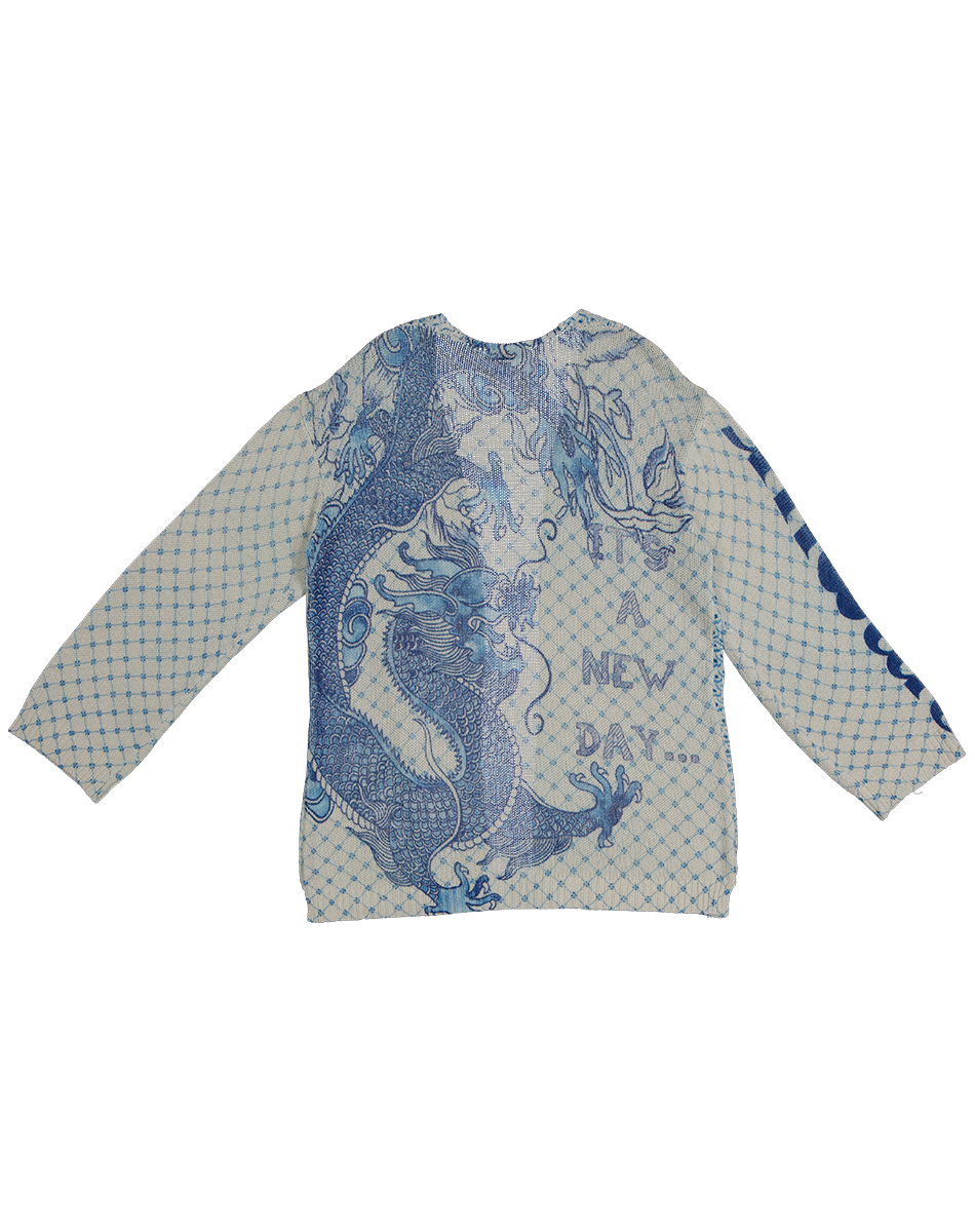 Mixed geometric print oversized open front cardigan in shades of blue and lavender. Long drop sleeves, two front pockets.One sleeve reads amour with a heart for the “o”. Front reads “BLUE RIBBON” (and something else I can’t read) with a bow. There is a circular patch on the bottom that reads “ DARLING, IT’S A NEW DAY” (and something else that I can’t read). Back has a large ornate dragon with some floral graphics and reads,”IT’S A NEW DAY”. Pair with our casual pants or shorts for a comfy easy to wear look.