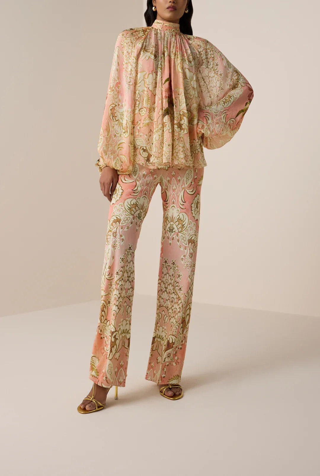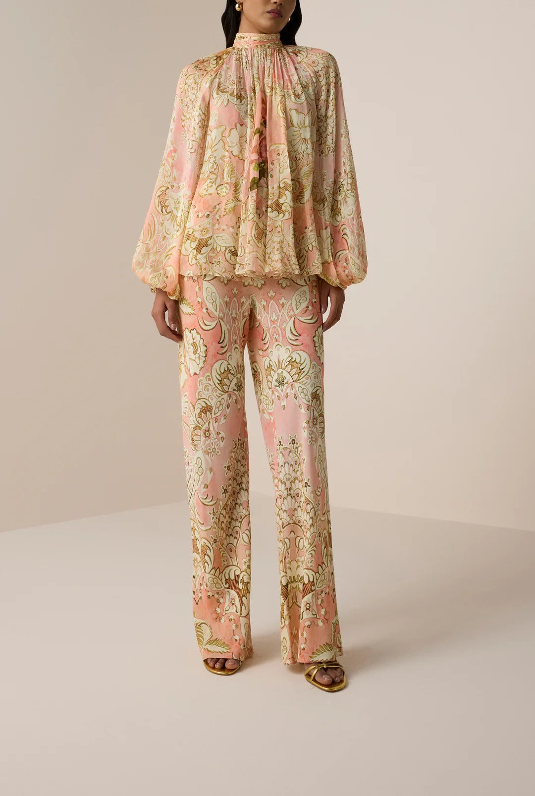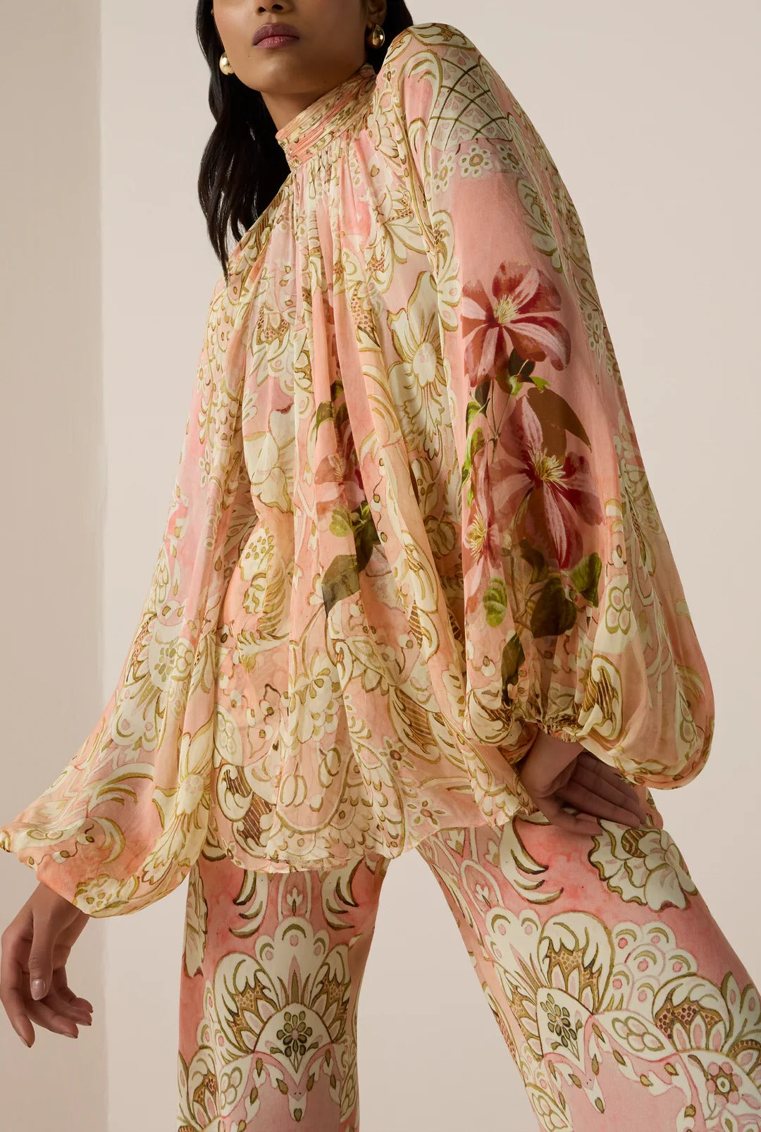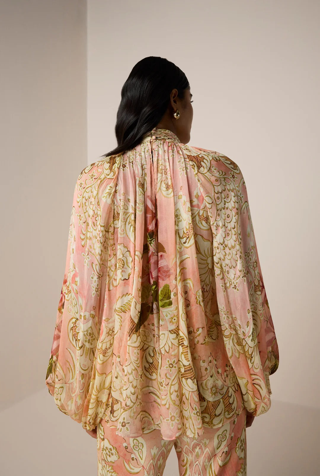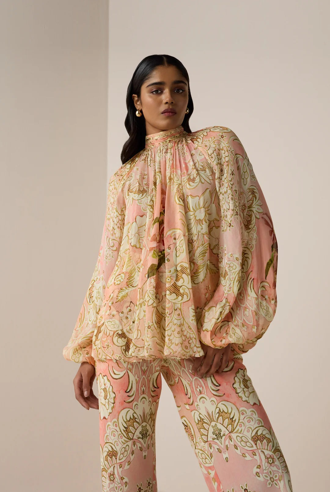 The Anah Top from the Ramadan'26 collection captures an ethereal, celebratory spirit in soft peach viscose gauze. Adorned with intricate filigree floral embroidery, this piece features a gathered high neckline, voluminous puffed sleeves, and a distinctive keyhole cutout at the back secured with a button closure. The relaxed, flowing silhouette drapes beautifully, while an interior lining ensures comfort throughout the day. Perfect for special occasions and festive gatherings, this top pairs seamlessly with the matching Anah trousers for a coordinated, enchanting ensemble.