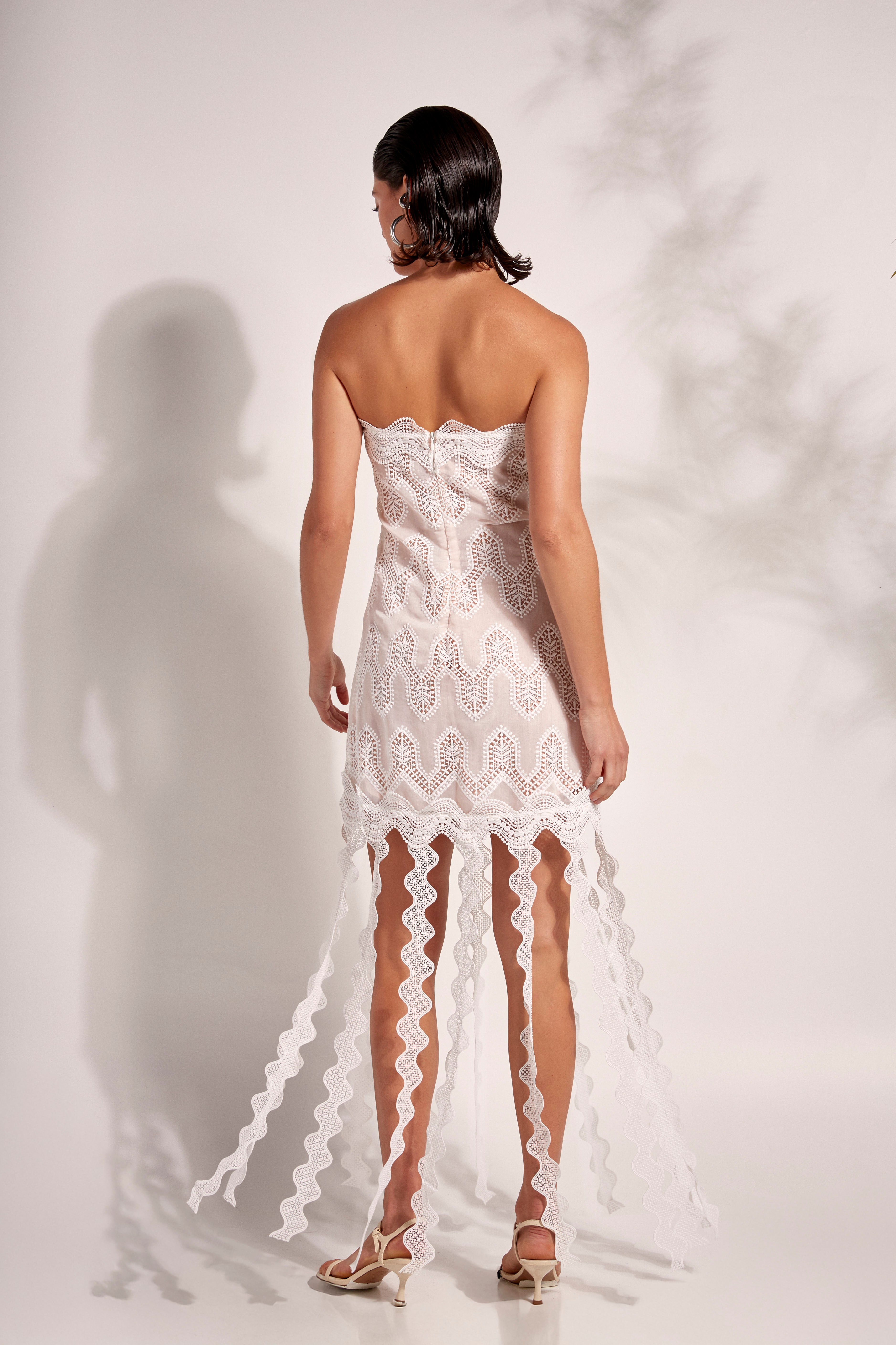 A striking strapless dress crafted from sheer white lace, featuring bold, undulating wave patterns for a contemporary, artistic effect.