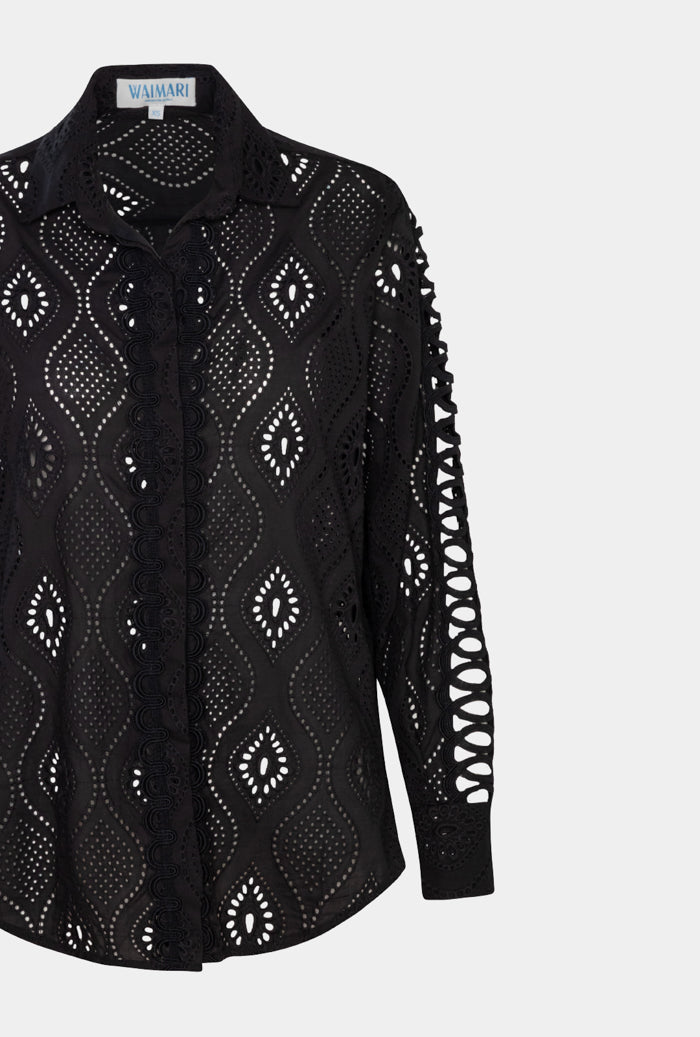 Oversized straight shirt with a hidden button placket and classic collar. Featuring long sleeves with back plackets, adorned with see-through lace inserts and two covered buttons on each cuff. The shirt is complemented with lace trims along the button placket and a cord belt adorned with hand-sewn embroidered flowers with pearls. Made of embroidered cotton eyelet fabric.